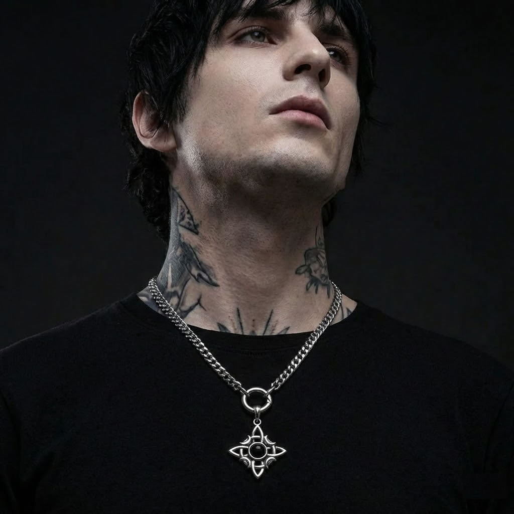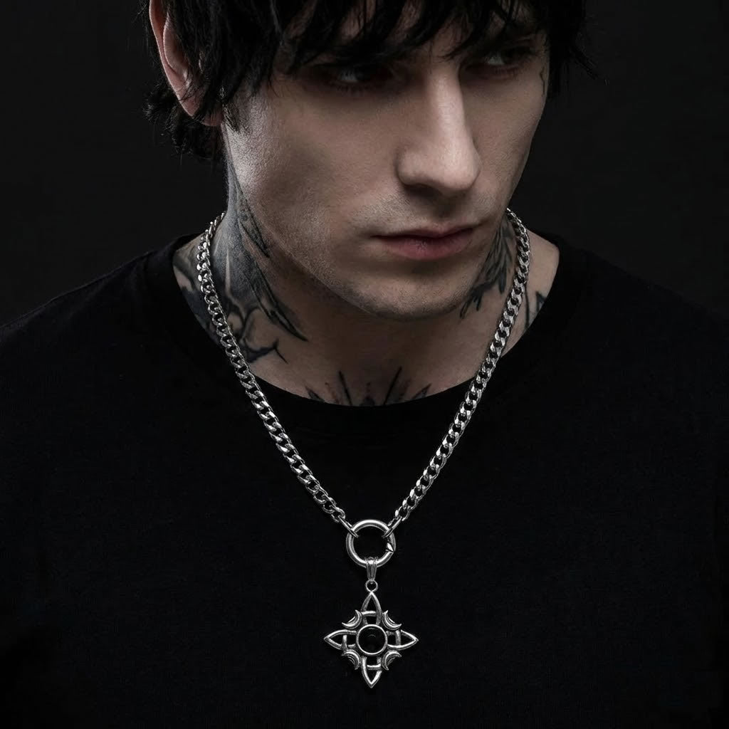 The interwoven crescent design forms a protective knot around a central black stone, a symbol of strength and protection. Crafted in solid stainless steel with a bold 8mm chain, this piece balances detail with weight, creating a bold statement with quiet power.